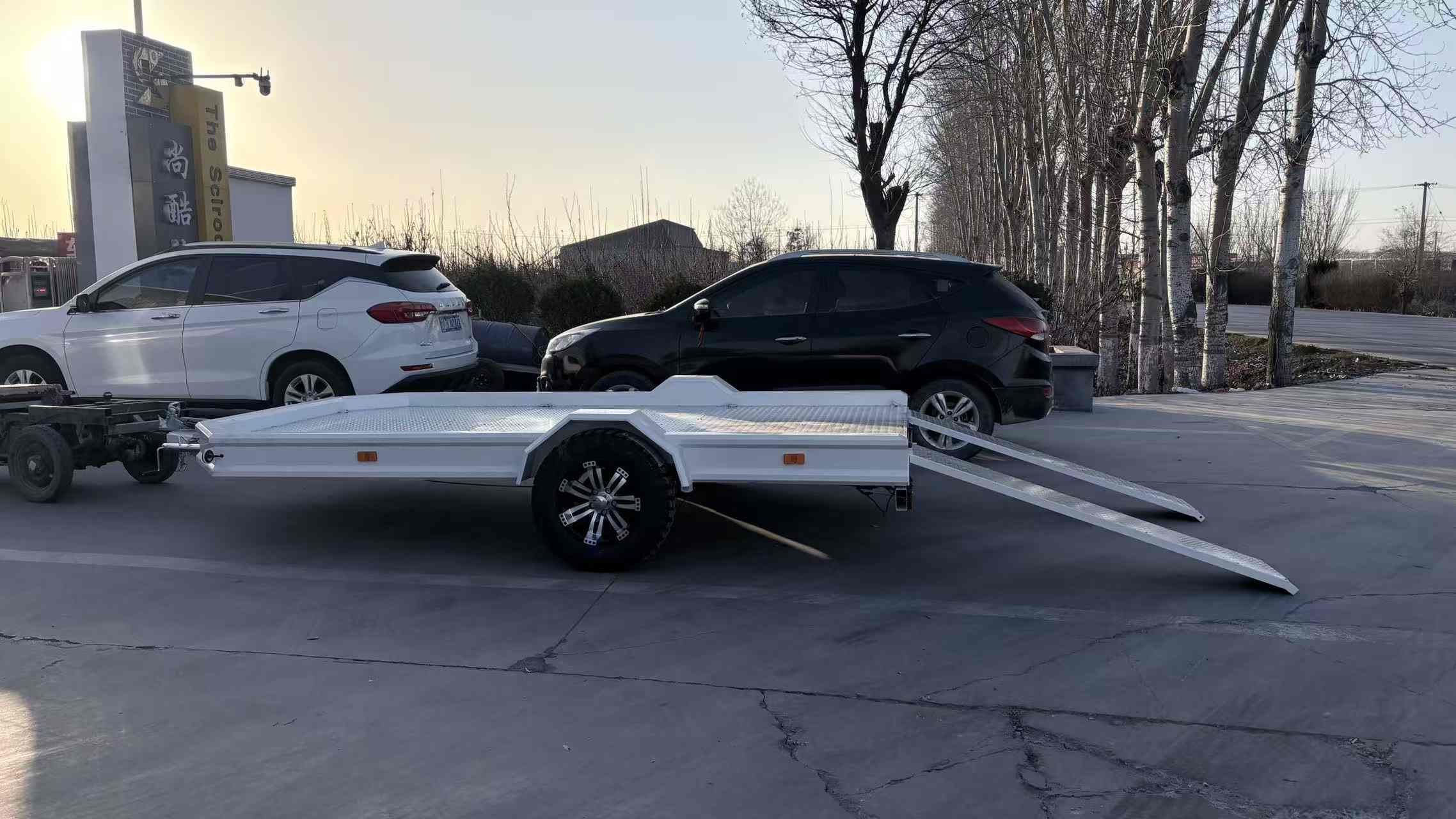 Il pianale del pianale è realizzato in lamiera di alluminio antiscivolo (o lamiera di acciaio resistente), che offre una superficie ad elevata trazione per evitare che il carico si sposti durante il trasporto. L'opzione del piatto in alluminio è leggera e resistente alla corrosione, ideale per l'uso esterno in ambienti umidi o costieri, mentre il piatto in acciaio offre la massima durata per carichi pesanti e abrasivi. Il design a basso profilo e le rampe integrate rendono il caricamento di ATV, UTV e piccole attrezzature rapido e semplice.